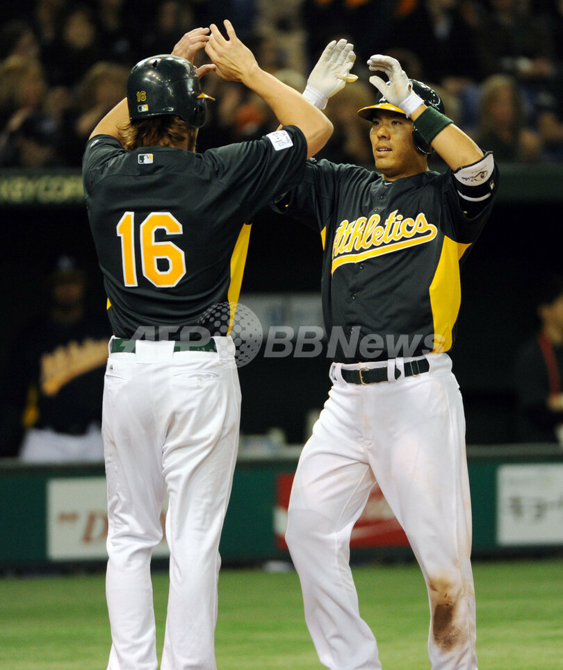 【3月26日 AFP】28日と29日に日本で行われる12MLB開幕シリーズを控えるオークランド・アスレチックス(Oakland Athletics)は25日、東京ドーム(Tokyo Dome)でプロ野球の読売ジャイアンツ(Yomiuri Giants)とプレシーズンゲームを行い、5-0で勝利した。(c)AFP