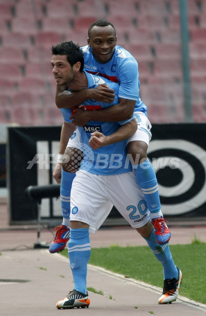 後半16分に先制点を挙げ、フアン・スニガ(Juan Zuniga、右)と喜ぶナポリのブレリム・ジェマイリ(Blerim Dzemaili、2012年3月25日撮影)。(c)AFP/CARLO HERMANN