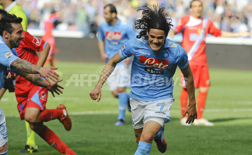 後半22分に追加点を挙げ歓喜するナポリのエディンソン・カヴァーニ(Edinson Cavani、2012年3月25日撮影)。(c)AFP/ROBERTO SALOMONE