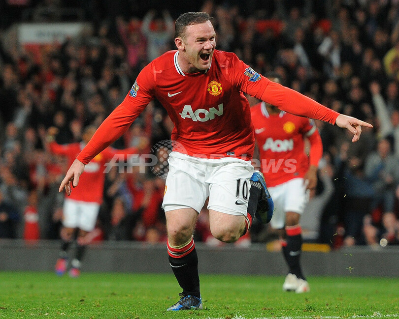 前半42分に先制点を挙げて歓喜するマンチェスター・ユナイテッドのウェイン・ルーニー(Wayne Rooney、2012年3月26日撮影)。(c)AFP/ANDREW YATES