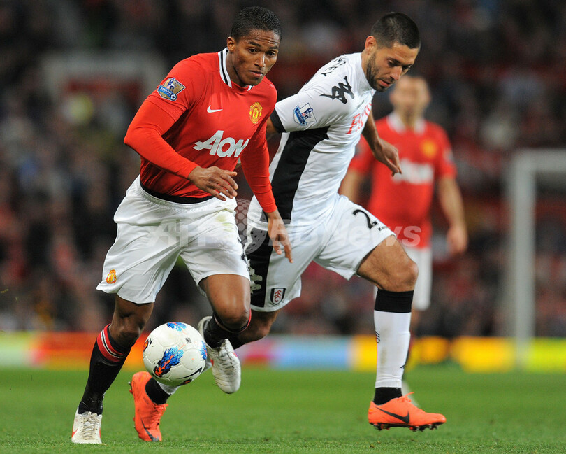 フラムのクリント・デンプシー(Clint Dempsey)のチェックを受けるマンチェスター・ユナイテッドのルイス・アントニオ・バレンシア(Luis Antonio Valencia、2012年3月26日撮影)。(c)AFP/ANDREW YATES