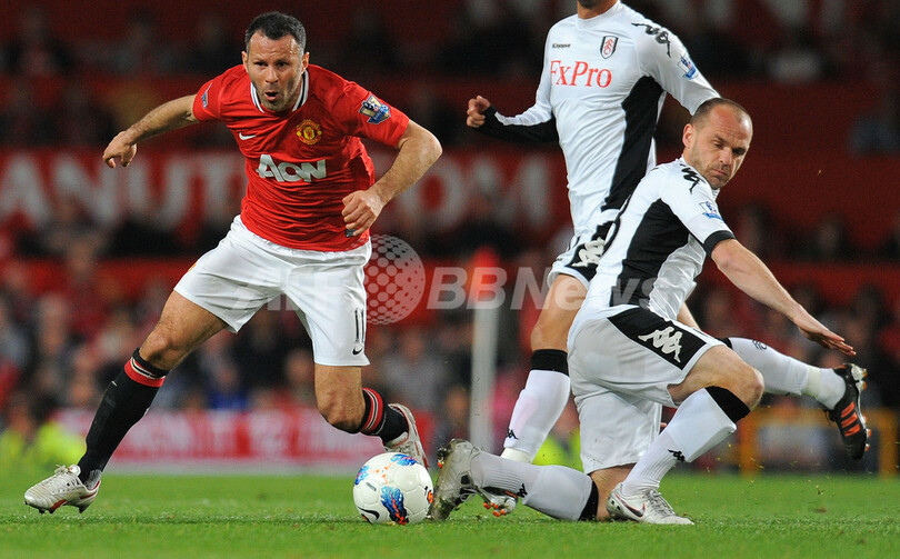 フラムのダニー・マーフィー(Danny Murphy)とボールを競るマンチェスター・ユナイテッドのライアン・ギグス(Ryan Giggs、2012年3月26日撮影)。(c)AFP/ANDREW YATES