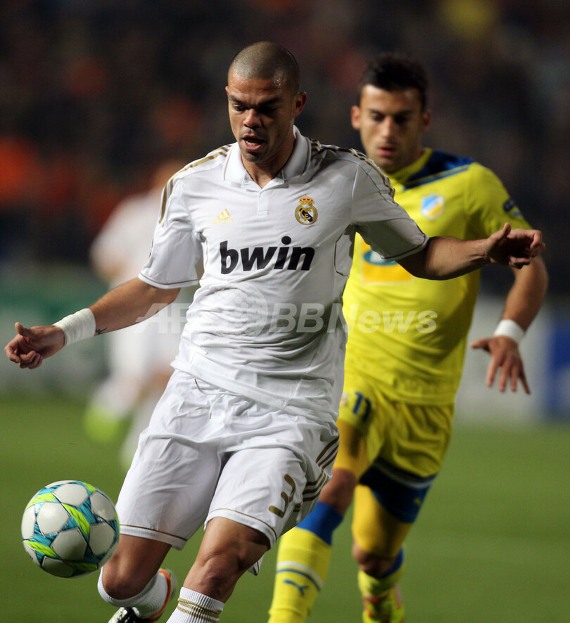 アポエル・ニコシアのイバン・トリツコブスキ(Ivan Trickovski、右)を振り切り、ボールを追うレアル・マドリードのペペ(Pepe、2012年3月27日撮影)。(c)AFP/JACK GUEZ
