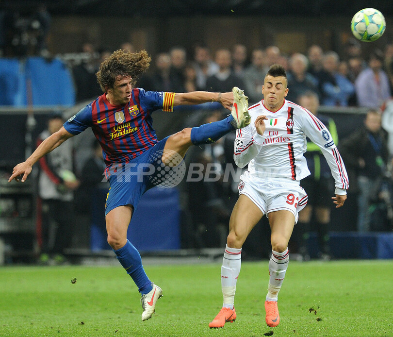 ACミランのステファン・エル・シャーラウィ(Stephan El Shaarawy、右)とボールを競るFCバルセロナのカルレス・プジョル(Carles Puyol、2012年3月28日撮影)。(c)AFP/ALBERTO LINGRIA