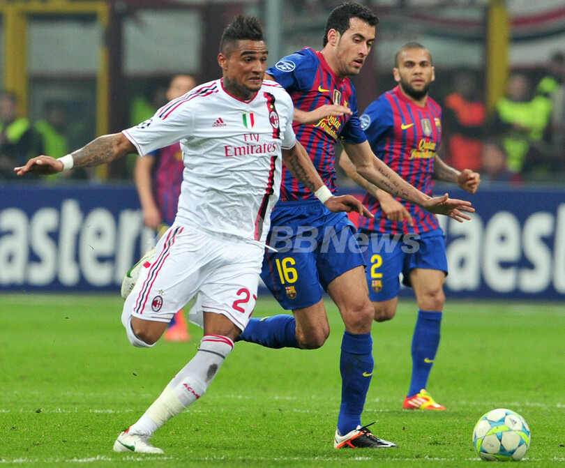 ACミランのケヴィン・プリンス・ボアテング(Kevin Prince Boateng、左)とボールを競るFCバルセロナのセルヒオ・ブスケッツ(Sergio Busquets、2012年3月28日撮影)。(c)AFP/GIUSEPPE CACACE