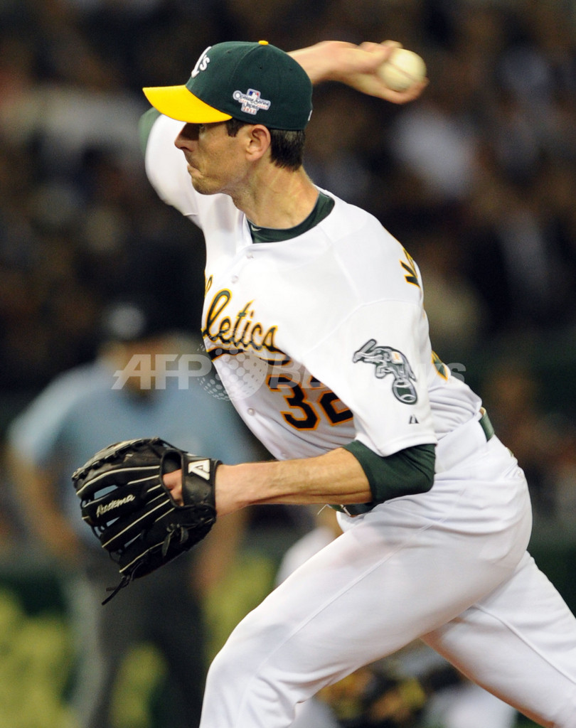 先発登板し、7回を投げ6安打1失点で降板したオークランド・アスレチックスのブランドン・マッカーシー(Brandon McCarthy、2012年3月28日撮影)。(c)AFP/TOSHIFUMI KITAMURA