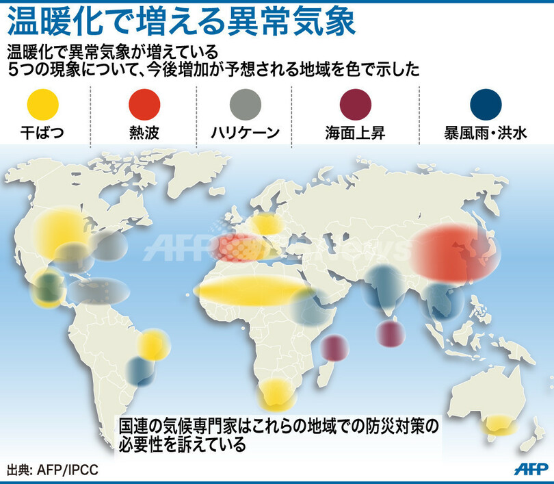 【3月29日 AFP】気候変動によって干ばつや洪水、嵐や海面の上昇といった異常気象のリスクが拡大し、全ての国にとって脅威となっているが、特に小さな島国や貧困国、乾燥地帯での脅威は深刻だ――。国連(UN)の「気候変動に関する政府間パネル(Intergovernmental Panel on Climate Change、IPCC)」は27日、気候変動と異常気象に関する初の報告書の完全版(592ページ)を発表し、このような警告を発した。