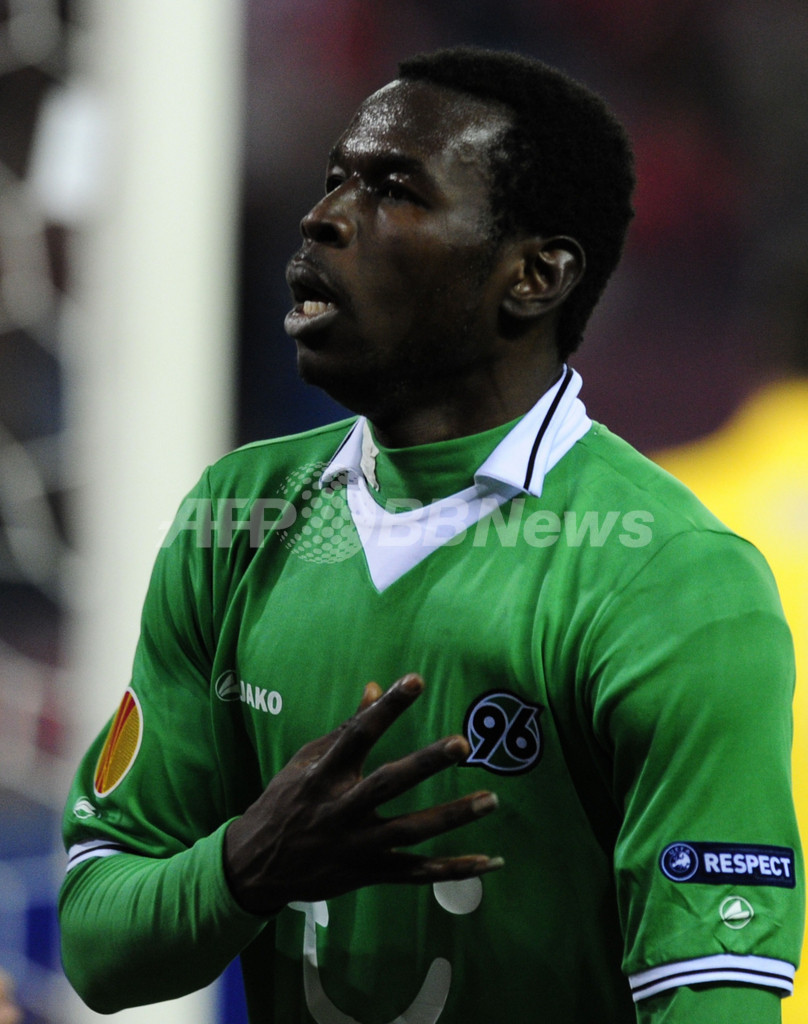 前半38分に同点ゴールを挙げ歓喜するハノーバー96のマメ・ビラム・ディウフ(Mame Biram Diouf、2012年3月29日撮影)。(c)AFP/JAVIER SORIANO