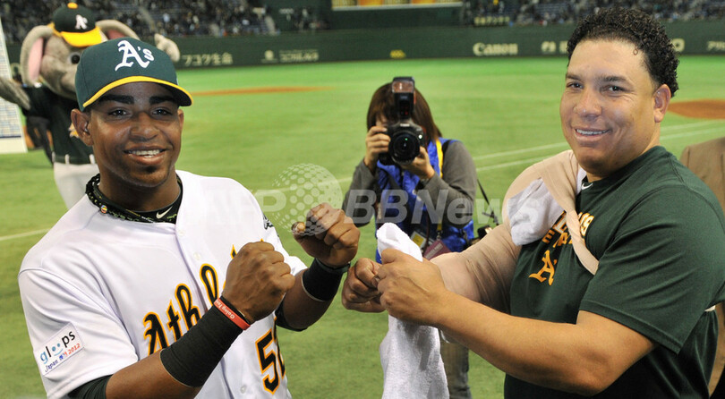 試合後、カメラに向けてポーズをとるオークランド・アスレチックスのヨエニス・セスペデス(Yoenis Cespedes、左)とバートロ・コロン(Bartolo Colon、2012年3月29日撮影)。(c)AFP/KAZUHIRO NOGI