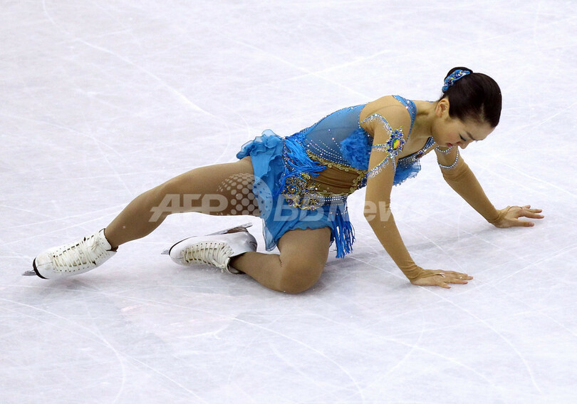 転倒する浅田真央(2012年3月29日撮影)。(c)AFP/VALERY HACHE