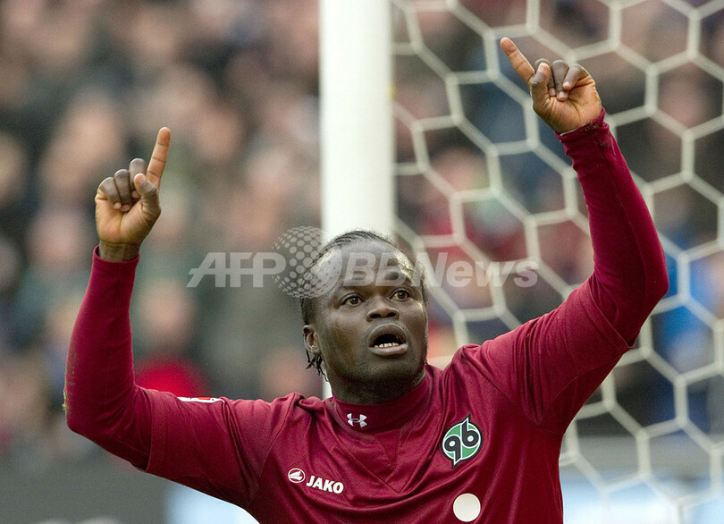 得点を挙げ歓喜するハノーバー96のディディエ・コナン(Didier Konan Ya、2012年4月1日撮影)。(c)AFP/JOHN MACDOUGALL