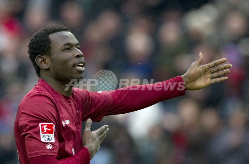 得点を挙げ歓喜するハノーバー96のディディエ・コナン(Didier Konan Ya、2012年4月1日撮影)。(c)AFP/JOHN MACDOUGALL