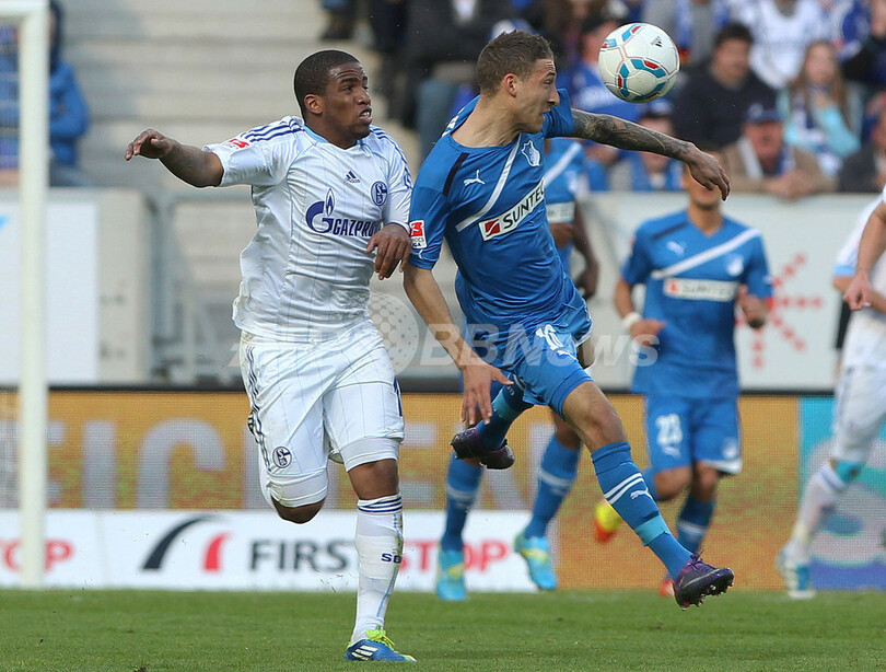 1899ホッフェンハイムのファビアン・ジョンソン(Fabian Johnson、右)とボールを競るシャルケ04のジェファーソン・ファルファン(Jefferson Farfan、2012年4月1日撮影)。(c)AFP/DANIEL ROLAND