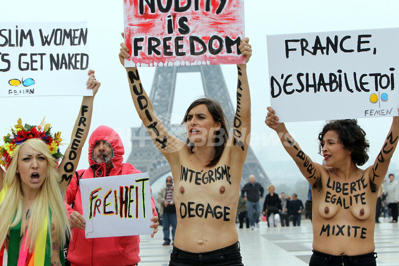 トップレスでイスラム教社会の「女性差別」に抗議、パリ