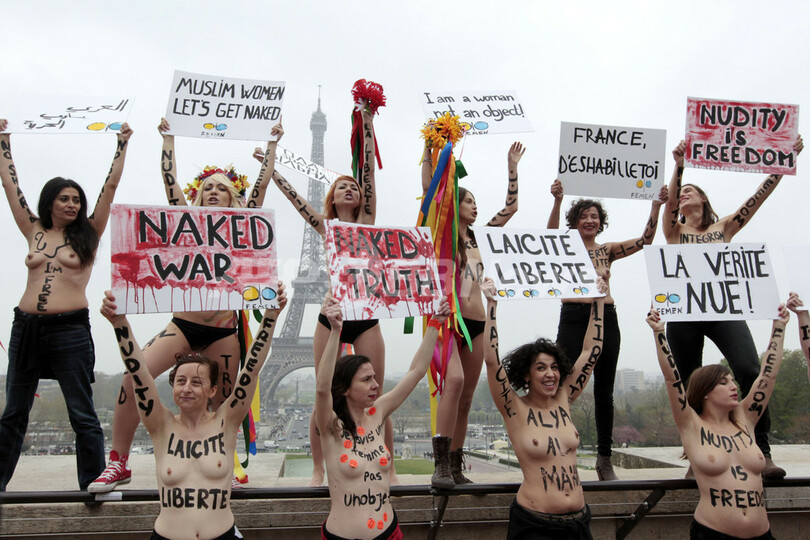【4月1日 AFP】パリ(Paris)中心部のトロカデロ(Trocadero)広場で3月31日、ウクライナの女性権利団体「FEMEN」のメンバーが、トップレスでイスラム教社会の女性差別的な政策に抗議するデモを行った。FEMENメンバーたちは、イスラム教の女性たちにシャリア(Sharia、イスラム法)に立ち向かうよう呼び掛けた。(c)AFP
