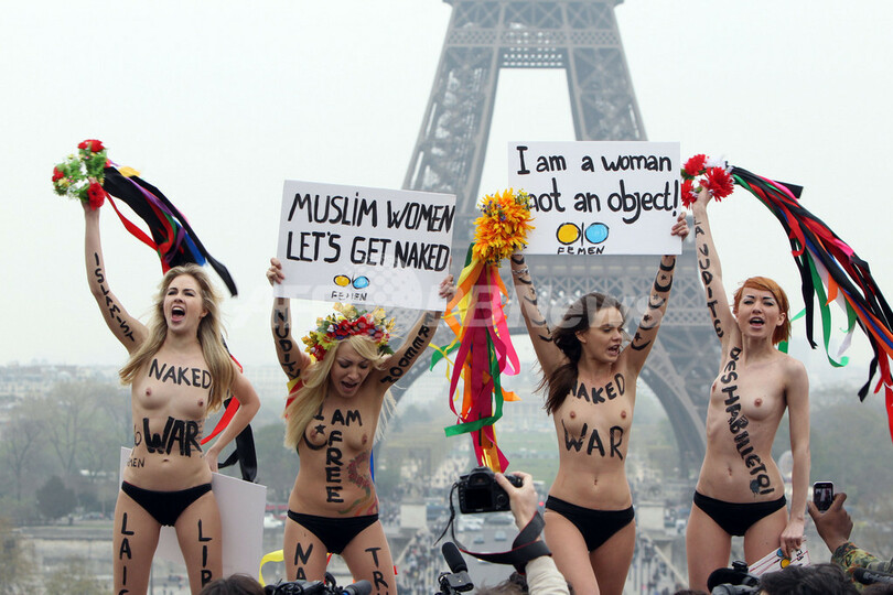 トップレスでイスラム教社会の「女性差別」に抗議、パリ