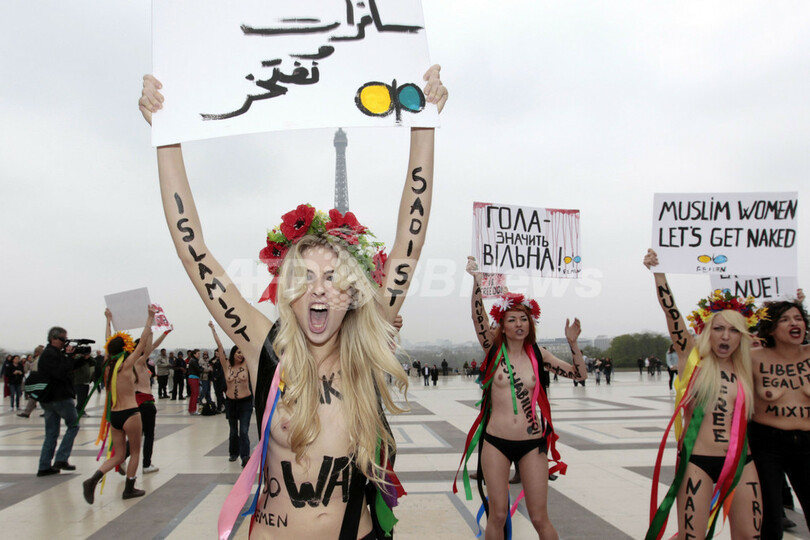 トップレスでイスラム教社会の「女性差別」に抗議、パリ