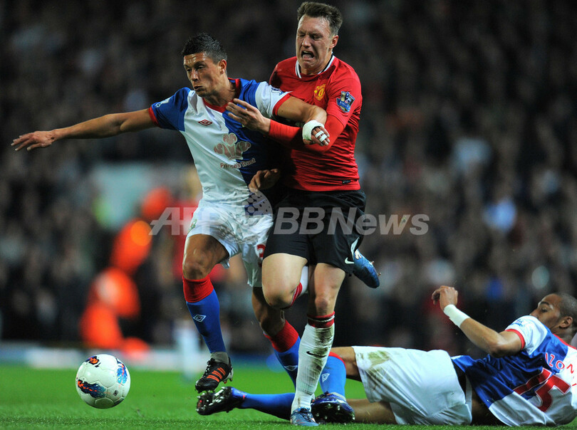 ブラックバーン・ローバーズのジェイソン・ロウ(Jason Lowe、左)と競り合うマンチェスター・ユナイテッドのフィル・ジョーンズ(Phil Jones、中央、2012年4月2日撮影)。(c)AFP/ANDREW YATES