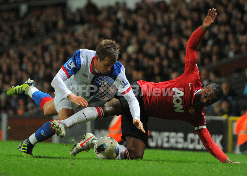 ブラックバーン・ローバーズのモアテン・ガムスト・ペデルセン(Morten Gamst Pedersen、左)と競り合いピッチに倒れるマンチェスター・ユナイテッドのパトリス・エヴラ(Patrice Evra、2012年4月2日撮影)。(c)AFP/ANDREW YATES