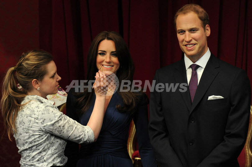 写真は、ロンドンで公開されたウィリアム王子とキャサリン妃のろう人形(2012年4月4日撮影)。(c)AFP/CARL COURT