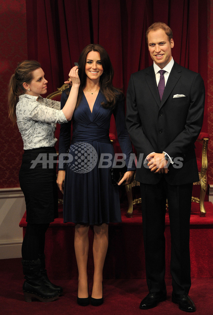 写真は、ロンドンで公開されたウィリアム王子とキャサリン妃のろう人形(2012年4月4日撮影)。(c)AFP/CARL COURT
