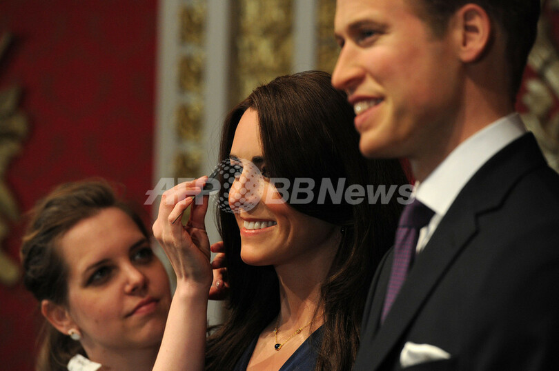 写真は、ロンドンで公開されたウィリアム王子とキャサリン妃のろう人形(2012年4月4日撮影)。(c)AFP/CARL COURT