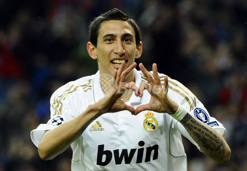 後半39分にチーム5得点目を挙げて歓喜するレアル・マドリードのアンヘル・ファビアン・ディ・マリア(Angel Fabian Di Maria、2012年4月4日撮影)。(c)AFP/PIERRE-PHILIPPE MARCOU