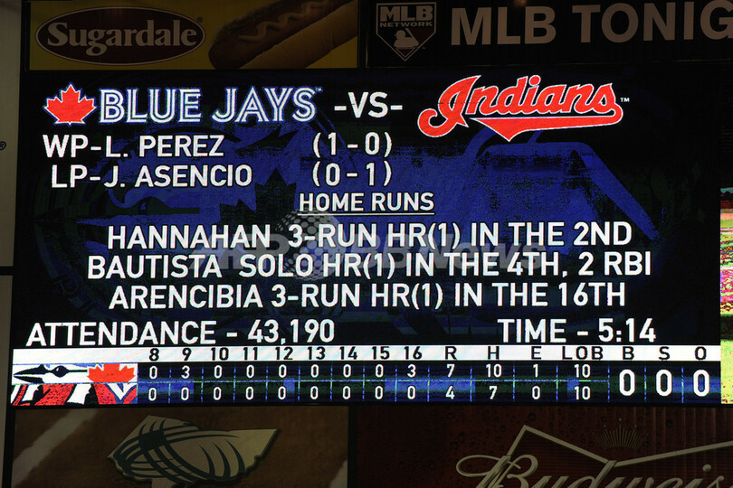 延長16回表にブルージェイズは、インディアンスの6番手ジャイロ・アセンシオ(Jairo Asencio)からジョナサン・ポール・アレンシビア(Jonathan Paul Arencibia)が決勝3点本塁打を放った。