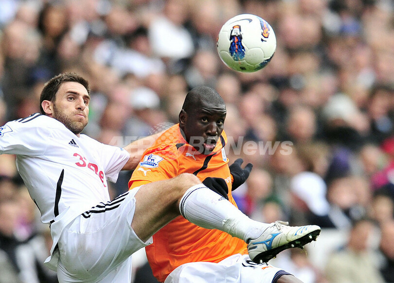 スウォンジー・シティのアンヘル・ランヘル(Angel Rangel、左)とボールを競るニューカッスルのパピス・シセ(Papiss Cisse、2012年4月6日撮影)。(c)AFP/GLYN KIRK