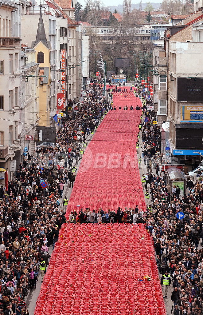 【4月7日 AFP】欧州で第2次世界大戦以来、最悪の戦闘となったボスニア内戦の開始から20年を迎え、ボスニア・ヘルツェゴビナの首都サラエボ(Sarajevo)の目抜き通りでは6日、包囲下で死亡した市民1万1541人を象徴する1万脚以上の赤いいすを並べ、オーケストラが演奏する追悼式典が行われた。