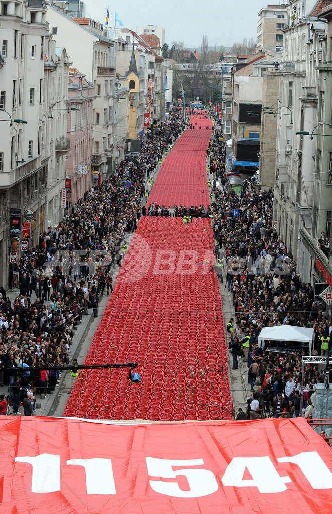 【4月7日 AFP】欧州で第2次世界大戦以来、最悪の戦闘となったボスニア内戦の開始から20年を迎え、ボスニア・ヘルツェゴビナの首都サラエボ(Sarajevo)の目抜き通りでは6日、包囲下で死亡した市民1万1541人を象徴する1万脚以上の赤いいすを並べ、オーケストラが演奏する追悼式典が行われた。