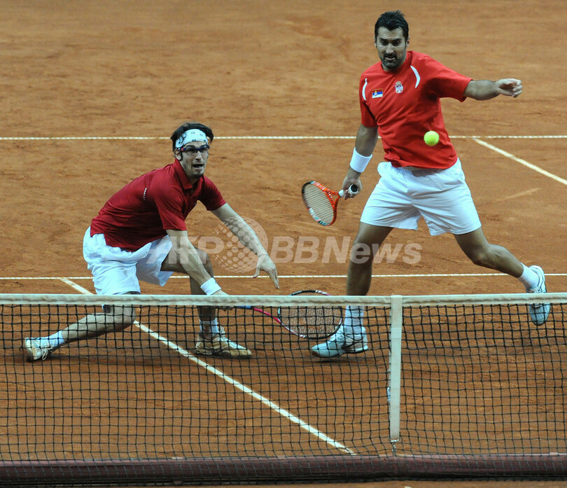試合に臨むセルビアのネナッド・ジモンイッチ(右)とイリャ・ボゾリャッチ(2012年4月7日撮影)。(c)AFP/MICHAL CIZEK