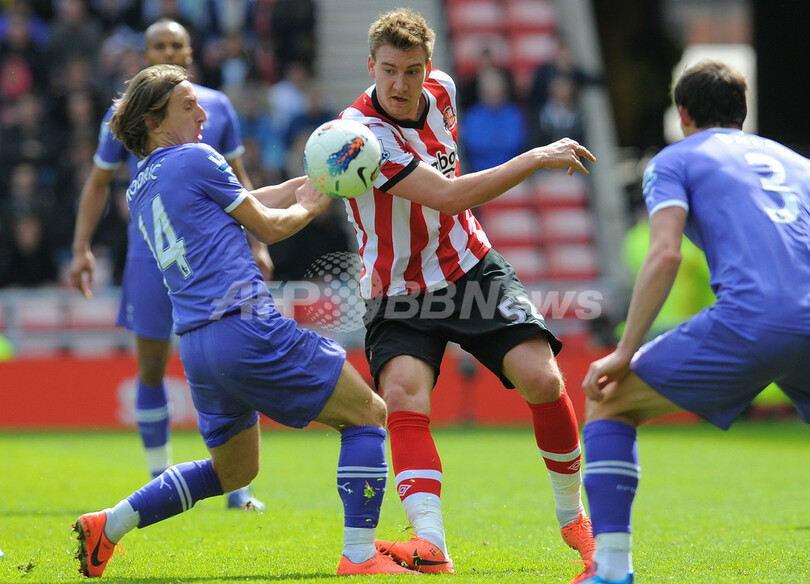 トッテナム・ホットスパーのルカ・モドリッチ(Luka Modric、左)とボールを競るサンダーランドのニクラス・ベントナー(Nicklas Bendtner、中央、2012年4月7日撮影)。(c)AFP/ANDREW YATES