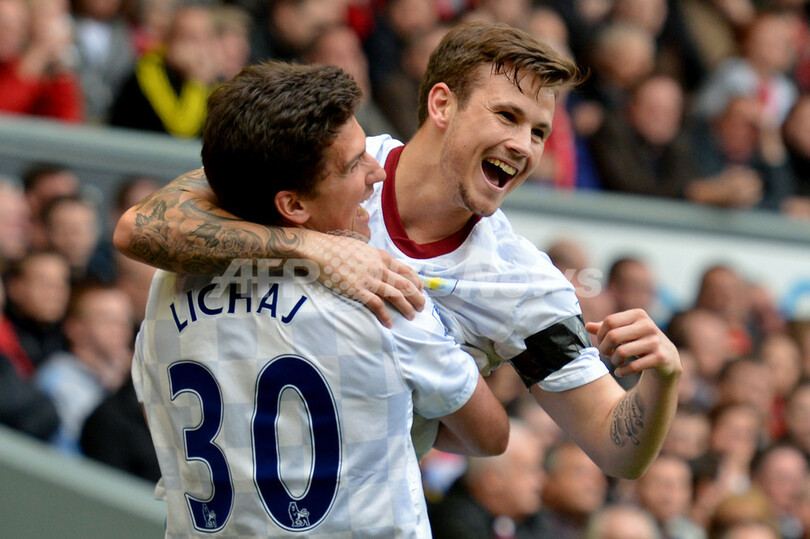 前半10分に先制ゴールを決めエリック・リチャイ(Eric Lichaj、左)と歓喜するアストン・ビラのクリス・ハード(Chris Herd、2012年4月7日撮影)。(c)AFP/BEN STANSALL