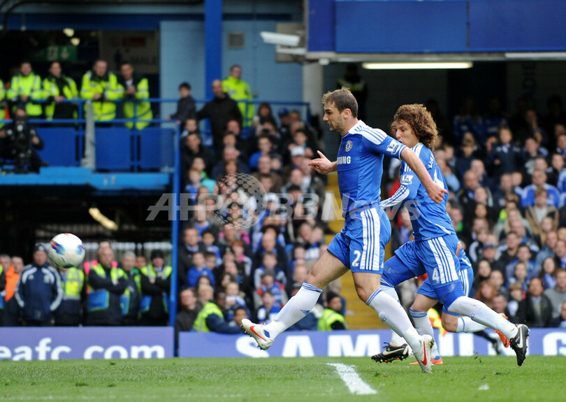 後半17分に先制ゴールを決めるチェルシーのブラニスラフ・イヴァノヴィッチ(Branislav Ivanovic、左、2012年4月7日撮影)。(c)AFP/OLLY GREENWOOD