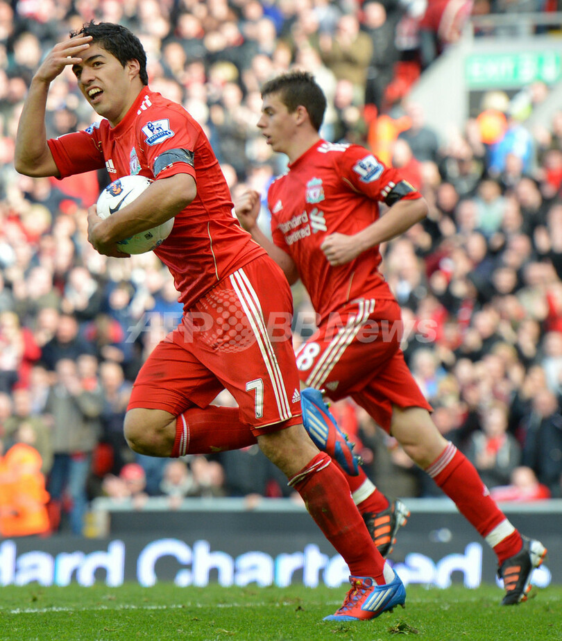 後半37分同点ゴールを決め歓喜するリバプールのルイス・スアレス(Luis Suarez、左、2012年4月7日撮影)。(c)AFP/BEN STANSALL