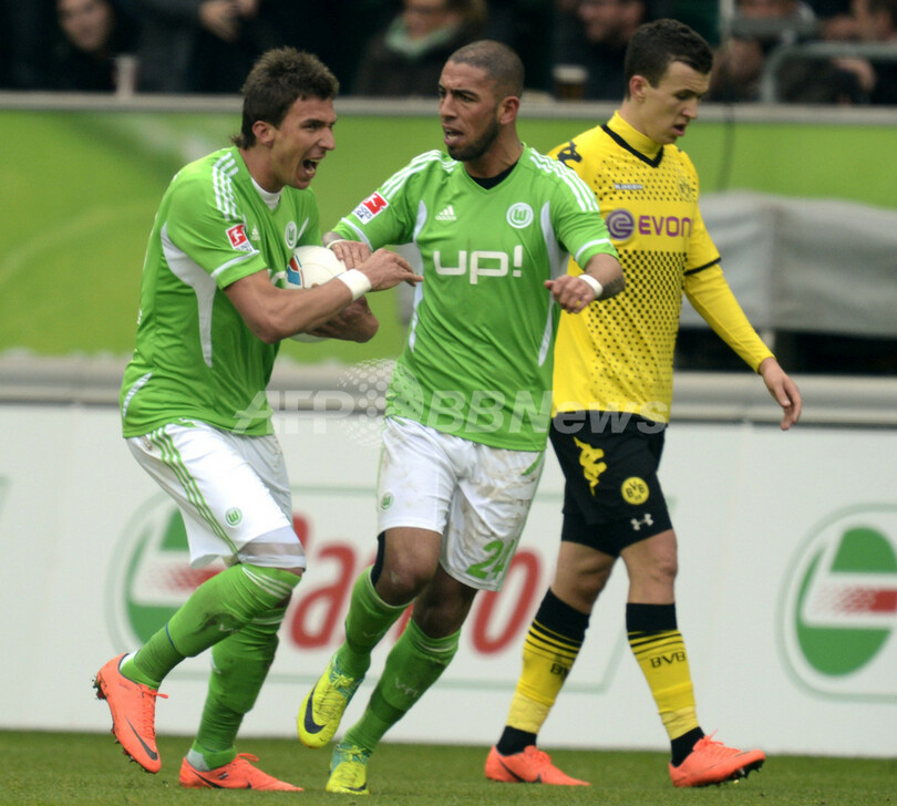 後半16分に追撃弾を決め、アシュカン・デヤガ(Ashkan Dejagah、中央)と喜ぶVfLボルフスブルクのマリオ・マンジュキッチ(Mario Mandzukic、左、2012年4月7日撮影)。(c)AFP/ODD ANDERSEN