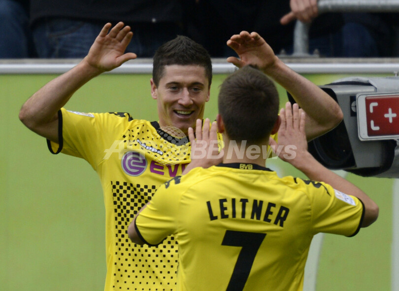 試合終了間際にチームの3点目を決め、モリッツ・ライトナー(Moritz Leitner、手前)と喜ぶボルシア・ドルトムントのロベルト・レワンドフスキ(Robert Lewandowski、2012年4月7日撮影)。(c)AFP/ODD ANDERSEN