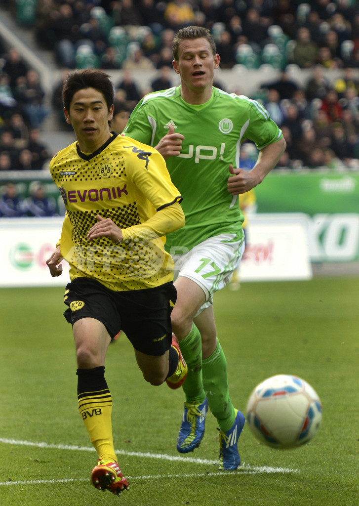 ボールを追うボルシア・ドルトムントの香川真司(Shinji Kagawa、左、2012年4月7日撮影)。(c)AFP/ODD ANDERSEN