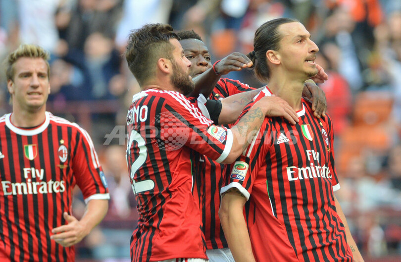 前半31分にペナルティーキック(PK)で先制ゴールを決め歓喜するACミランのズラタン・イブラヒモビッチ(Zlatan Ibrahimovic、2012年4月7日撮影)。(c)AFP/GIUSEPPE CACACE