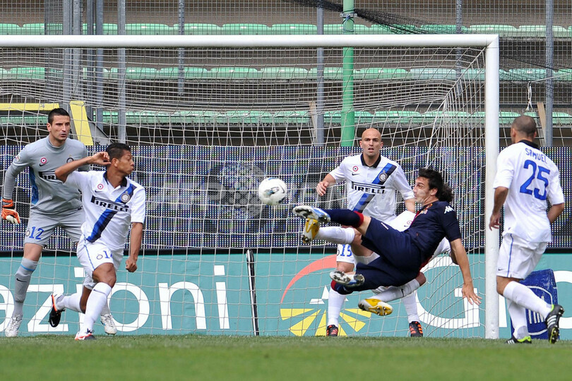 またインテル(Inter Milan)はカリアリ(Cagliari Calcio)と2-2で引き分け、ASローマ(AS Roma)が2-4でレッチェ(US Lecce)に敗れたため、両チームの勝ち点差は2に縮まっている。(c)AFP/Barnaby Chesterman