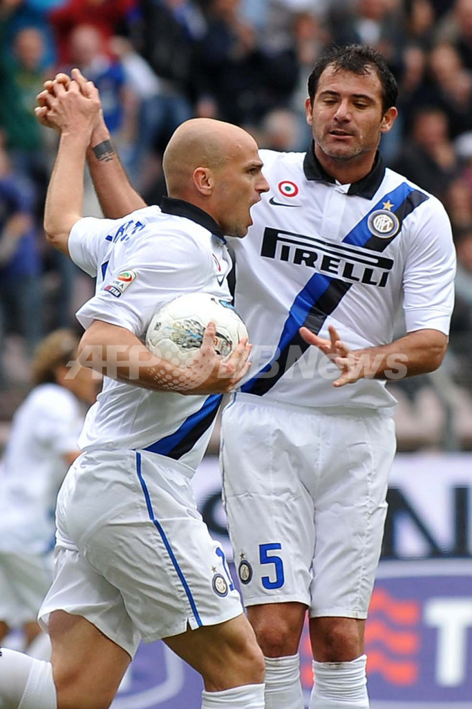 またインテル(Inter Milan)はカリアリ(Cagliari Calcio)と2-2で引き分け、ASローマ(AS Roma)が2-4でレッチェ(US Lecce)に敗れたため、両チームの勝ち点差は2に縮まっている。(c)AFP/Barnaby Chesterman