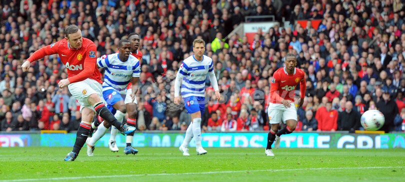 前半15分にPKで先制点を挙げるマンチェスター・ユナイテッドのウェイン・ルーニー(Wayne Rooney、2012年4月8日撮影)。(c)AFP/ANDREW YATES