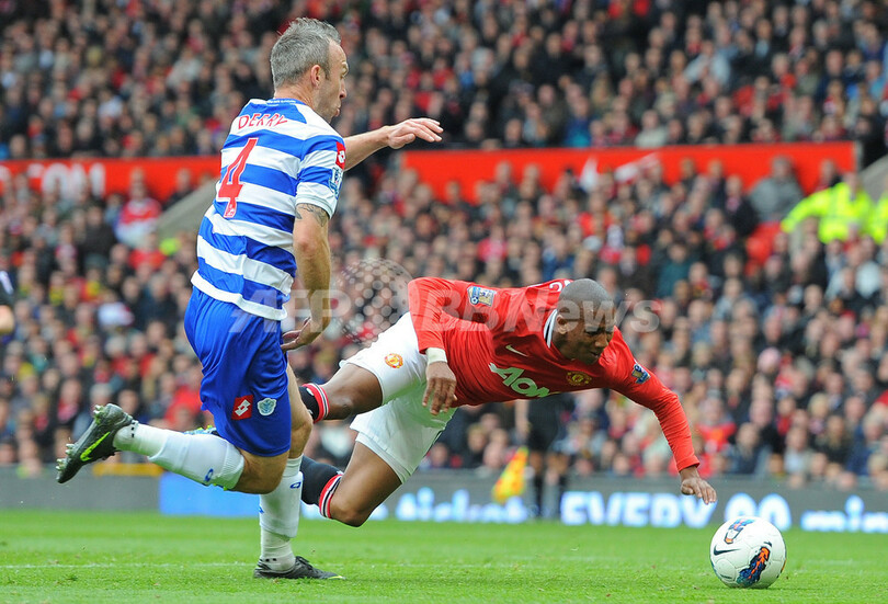 ユナイテッドにPKを与えた判定で、リー・メイソン(Lee Mason)主審はデリーにレッドカードを提示し退場処分を下したが、ヤングはオフサイドの位置でボールを受けており、デリーのファウルも最低限の接触に見えるため、QPRのマーク・ヒューズ(Mark Hughes)監督はレッドカードの取り消しを求め、上訴の意向を示している。(c)AFP/Julian Guyer