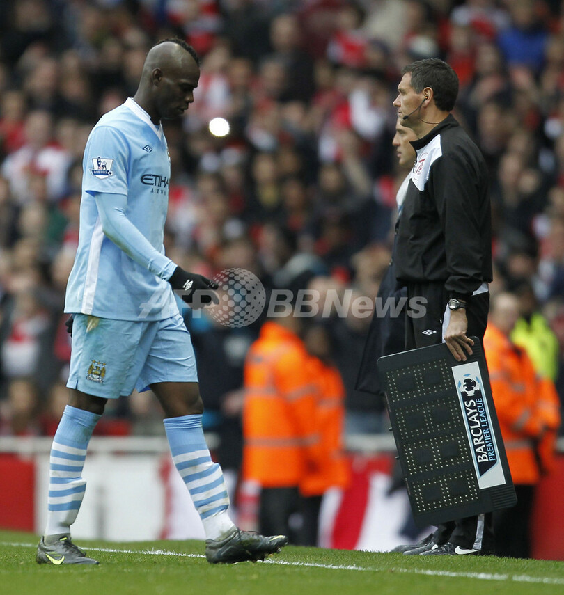レッドカードで退場処分となり、ピッチを後にするマンチェスター・シティのマリオ・バロテッリ(Mario Barwauh Balotelli、2012年4月8日撮影)。(c)AFP/IAN KINGTON