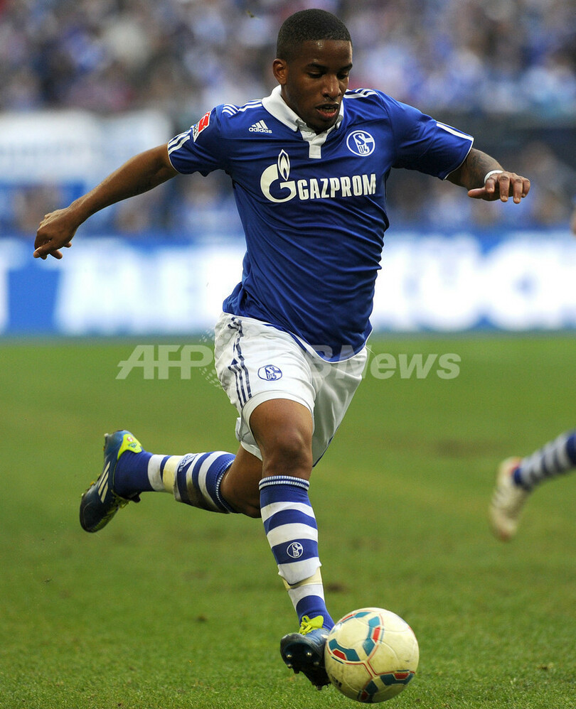 ボールをコントロールするシャルケのジェファーソン・ファルファン(Jefferson Farfan、2012年4月8日撮影)。(c)AFP/PATRIK STOLLARZ