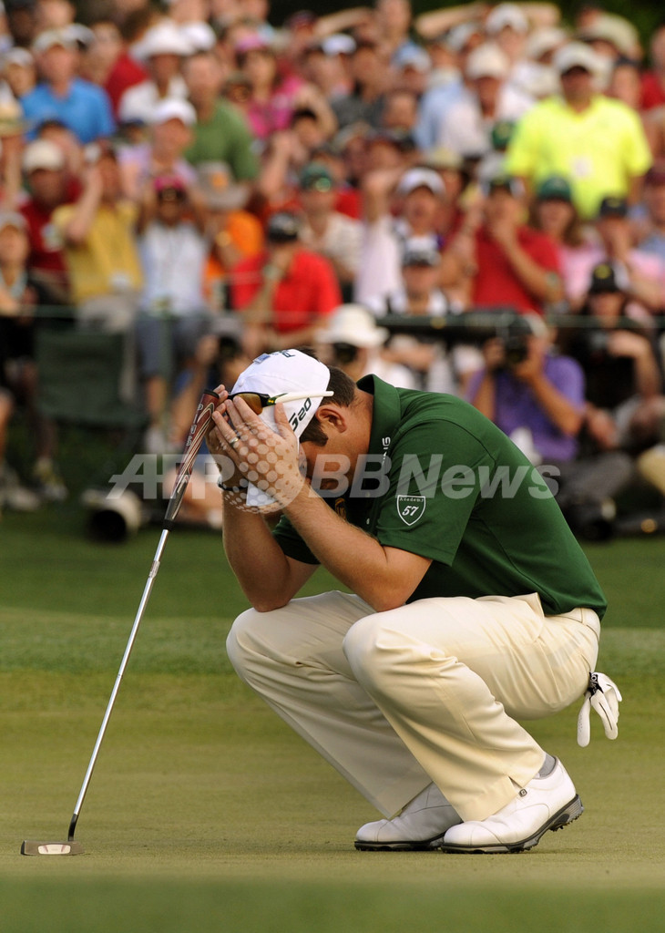 パットを外し頭を抱えるバッバ・ワトソン(2012年4月8日撮影)。(c)AFP/DON EMMERT