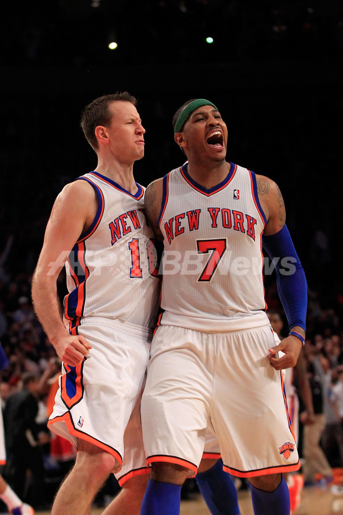 オーバータイムで決勝点を挙げてチームメイトのスティーブ・ノバック(Steve Novak)に祝福されるニックスのカーメロ・アンソニー(Carmelo Anthony、2012年4月8日撮影)。(c)AFP/Getty Images/Chris Trotman
