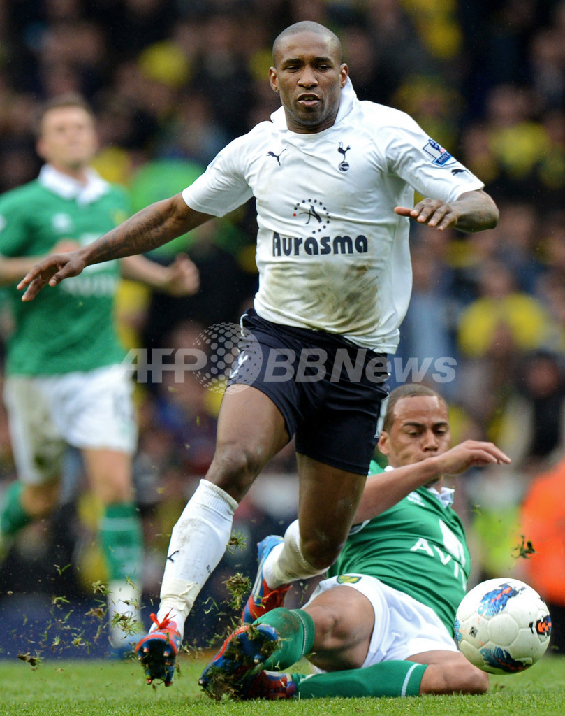 ノリッジ・シティのエリオット・ベネット(Elliott Bennett)のスライディングタックルを受けるトッテナム・ホットスパーのジャーメイン・デフォー(Jermaine Defoe、2012年4月9日撮影)。(c)AFP/BEN STANSALL
