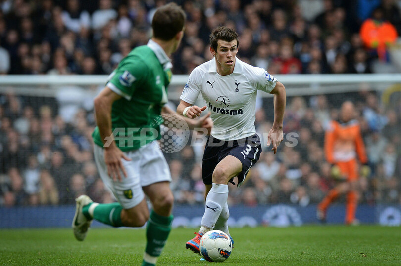 ドリブルでボールを運ぶトッテナム・ホットスパーのギャレス・ベイル(Gareth Bale、2012年4月9日撮影)。(c)AFP/BEN STANSALL